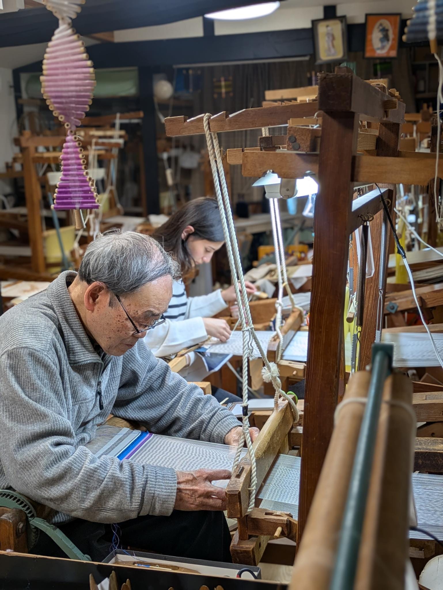 One of the hardest things for me to learn while weaving was developing a sense for how something would look once it was compressed by all the layers above it. Watching my teacher, Hirano-san, work was always interesting because part of me couldn’t help imagining what I would do the same (or differently) if I were working on the piece. He always knew exactly where to place each line of thread and how far to take it. Whenever I thought something looked like too much or too little, he would inevitably prove why his choice was right. Which of course is why he’s the master with over seventy years of experience, and I’m not!